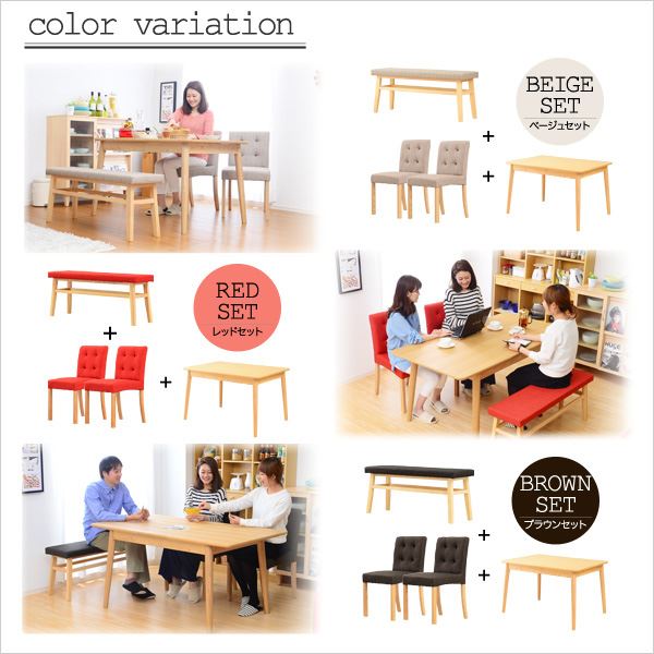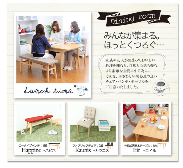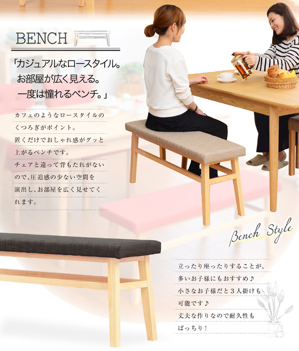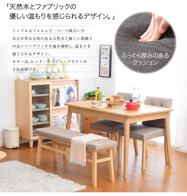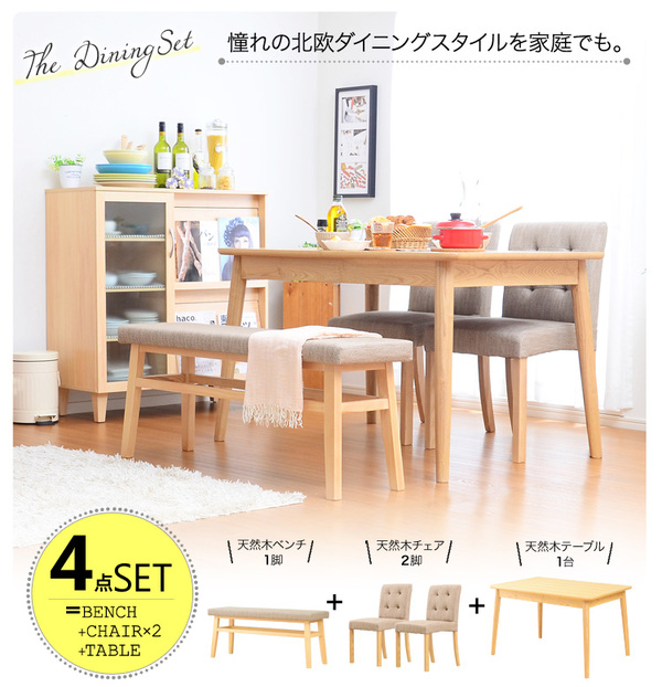 ナチュラルなテーブルとファブリックのチェア・ベンチのダイニング4点セット!