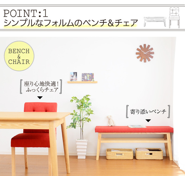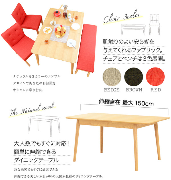 北欧風 ダイニングセット 4点 【レッド】 伸縮テーブル幅約120〜150cm ベンチ1台 ダイニングチェア2脚付き【代引不可】