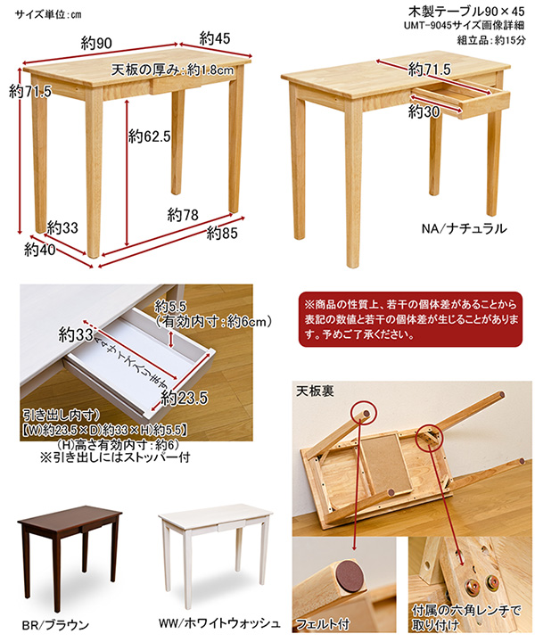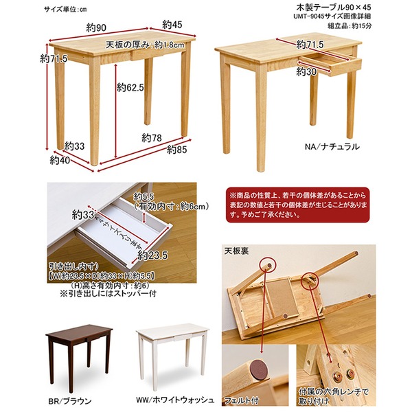 こちらは「木製テーブル 【90cm×45cm】 引出し1杯付き ホワイトウォッシュ 〔リビング/ダイニング/作業台〕」の商品ページです。商品画像や商品情報には、色違いやサイズ違いの商品が載っている場合がございます。ご注文前に色・サイズ・セット内容のご確認をお願いいたします。