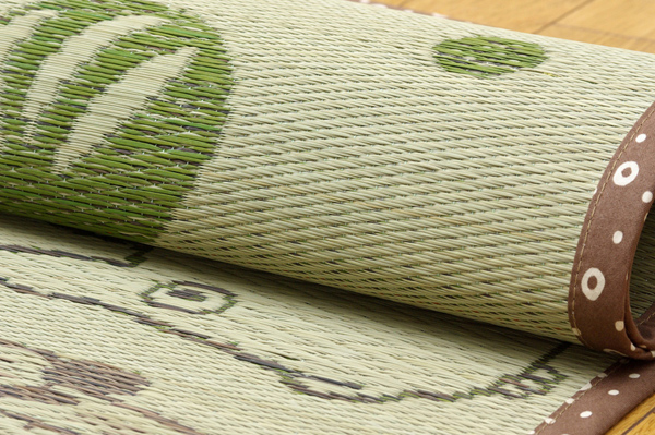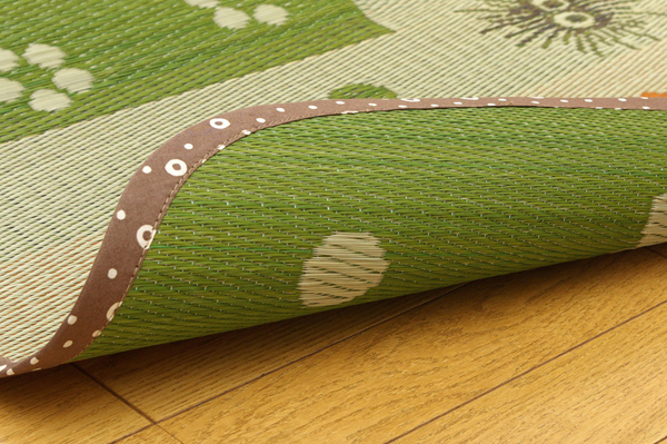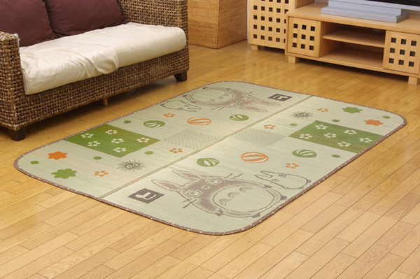 大人気。『となりのトトロ』のい草ラグです。コンパクトに収納できます。国産(九州産)い草を使用しています。一本一本が太く、表皮が厚く、繊維がキメ細かいので弾力性があり、耐久性に優れています。い草には空気の自然浄化作用、湿度の調節作用などがあります。また汚れにくく、使用するうちに黄金色に変化し味が出ます。い草に青森ヒバ加工を施しています。(抗菌、防臭効果)