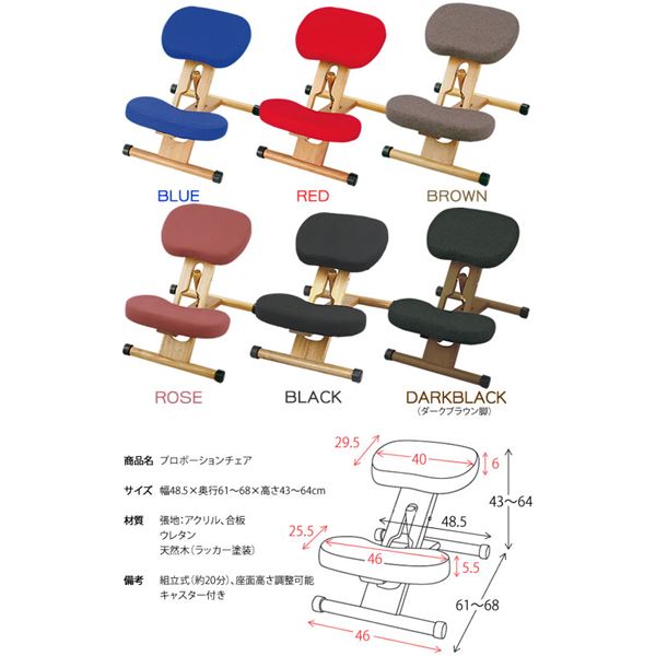 姿勢矯正椅子 幅48.5cm ブルー 木製 座面高さ調整可 キャスター付き プロポーションチェア 子供部屋 在宅ワーク