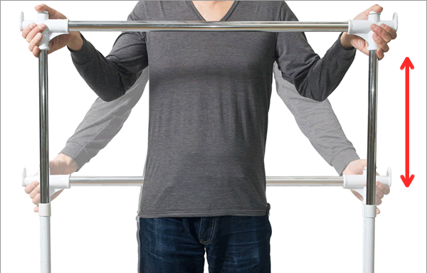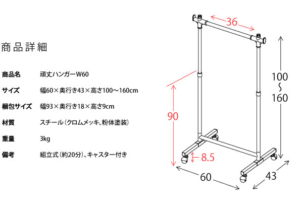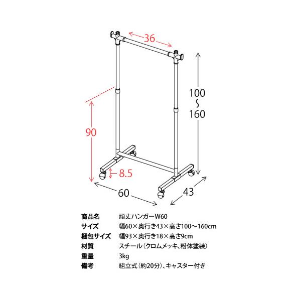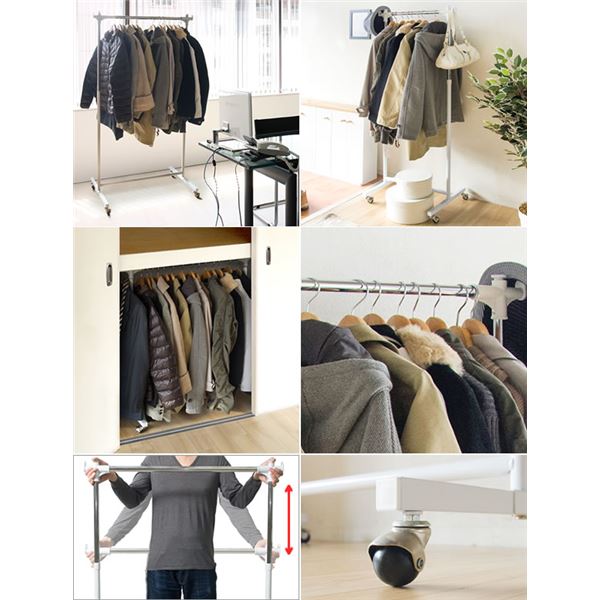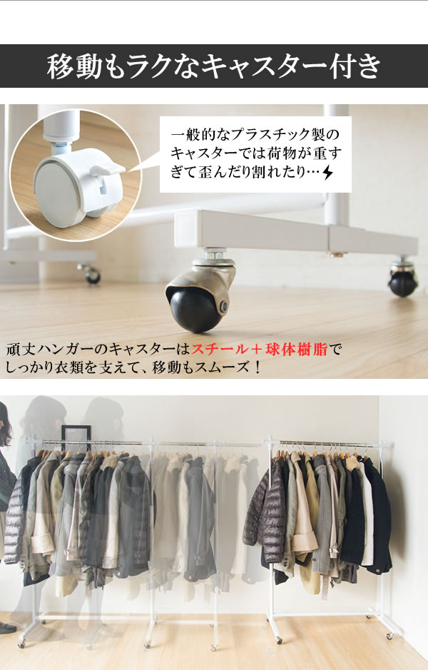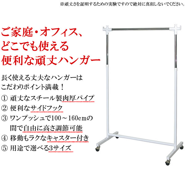 頑丈なスチール製肉厚パイプ 、便利なサイドフック、 ワンプッシュで100〜160cmの 間で自由に高さ調節可能、 移動もラクなキャスター付き 、用途で選べる3サイズ!