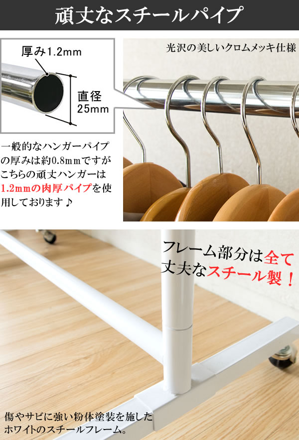 頑丈 ハンガーラック 幅60cm ホワイト スチール製 サイドフック キャスター付き 高さ調節可 リビング ベッドルーム オフィス