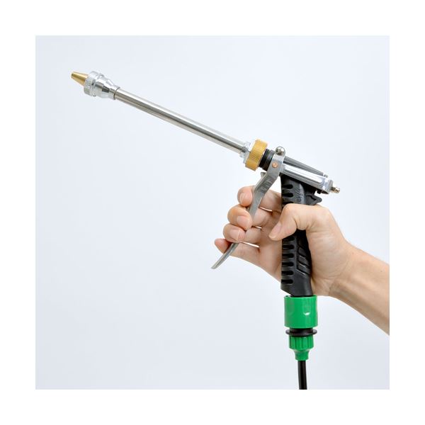 ウォーターガンは、握ったレバーの強さで、水圧/水流を調節することができます。深く握れば高圧ジェット水流。浅く握れば、低圧シャワー水流になります。