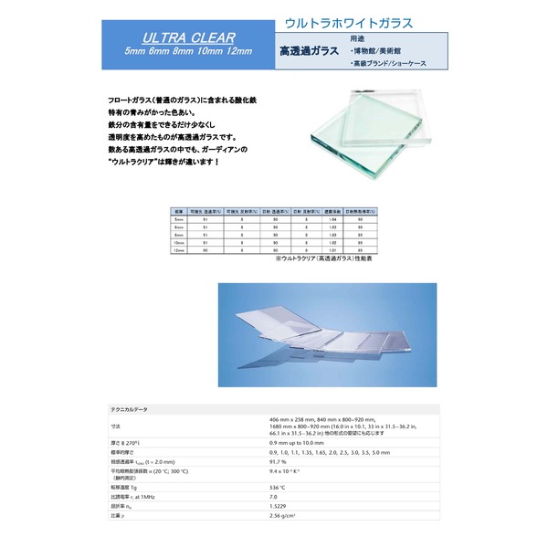 通常のガラス(フロートガラス)に比べ、光透過性が高く非常に透明感があり、無色透明で知られているクリスタルガラスよりも傷がつきにくい、ウルトラホワイトガラス使用しています。