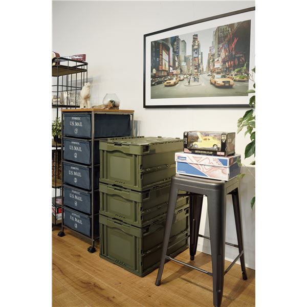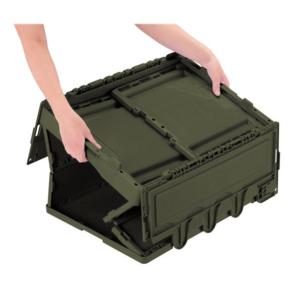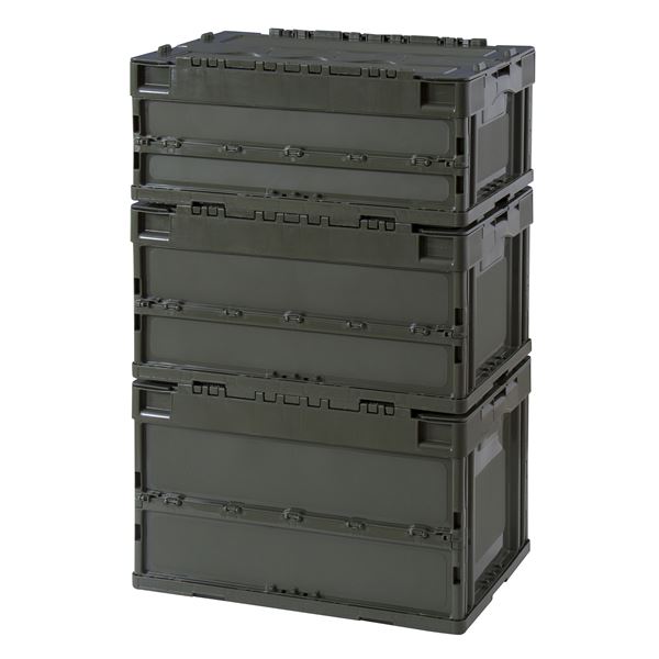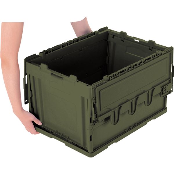 たっぷり収納できて強度も十分なオリーブドラブカラーのコンテナー。車の中、ベッド下、クローゼットなど様々な場所で大活躍です。 未使用時には折りたため、更にスタッキングもできるので、場所をとりません。