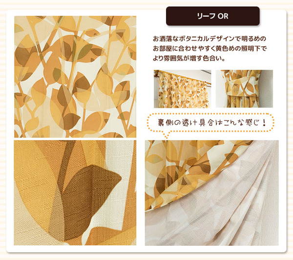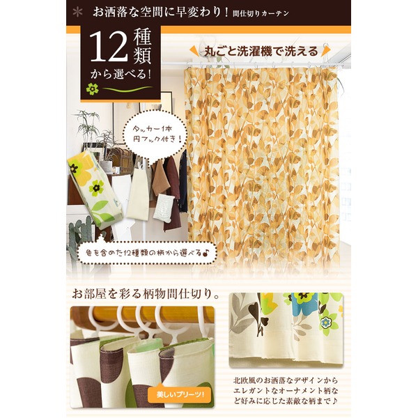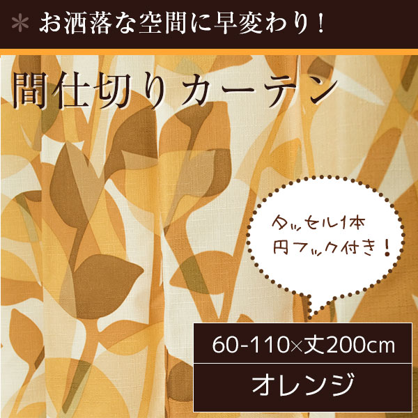 間仕切りカーテン / 幅60-110×丈200cm オレンジ リーフ柄 / フック リングランナー付き 『ラウンドリーフ』 九装