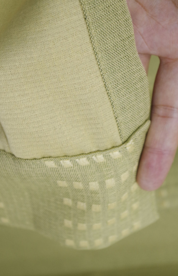 寸法変化率:水洗い(JIS L-1096 D法)→縦横ー1.0% ドライクリーニング→縦横ー1.0%(+は伸び、‐は縮み)
