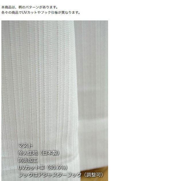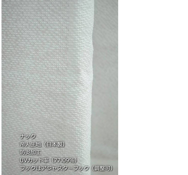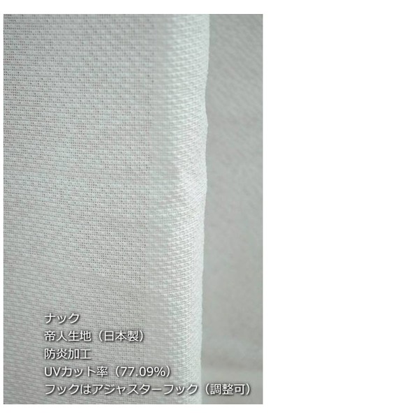 特徴:帝人生地、防炎加工、UVカット率83.03%、鉄フック(調整不可)