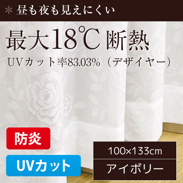 防炎 UVカット レースカーテン / 2枚組 100×133cm デザイヤー / アイボリー 最大18℃断熱 省エネ バラ柄 帝人 日本製 九装