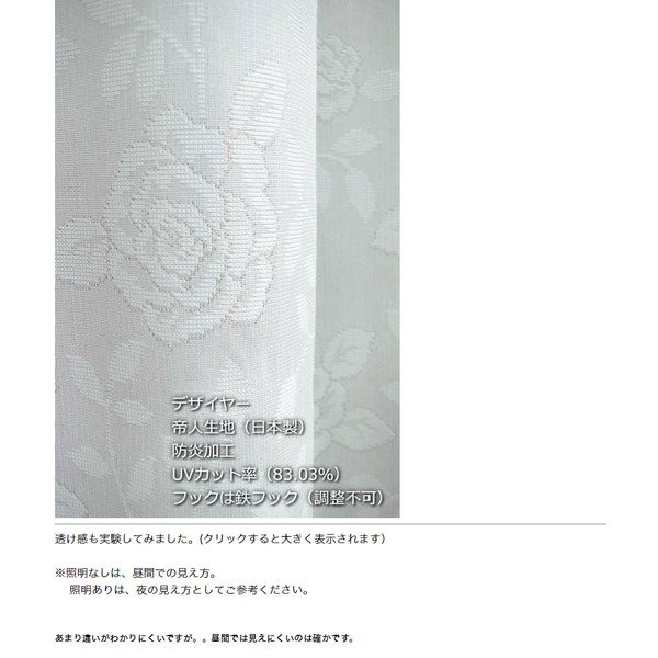 特徴:帝人生地、防炎加工、UVカット率83.03%、鉄フック(調整不可)