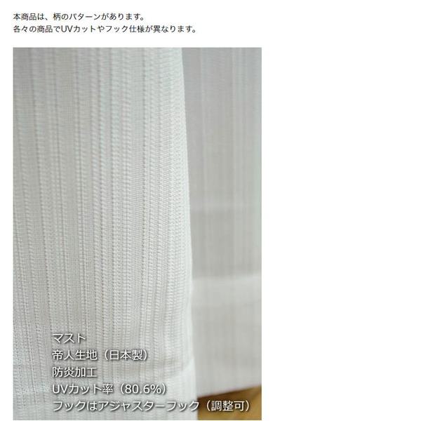 特徴:帝人生地、防炎加工、UVカット率80.6%、鉄フック(調整不可)