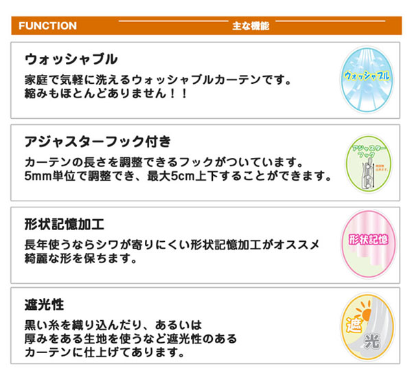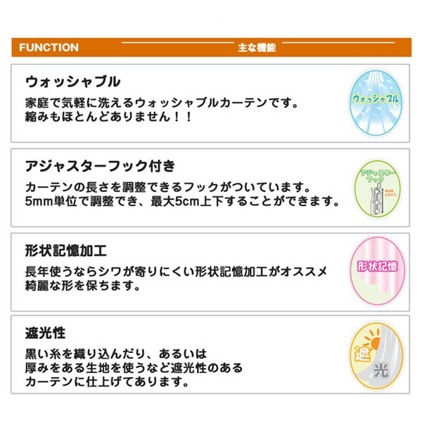 特徴:3級遮光、2重加工、形状記憶、ウォッシャブル(洗濯機可)