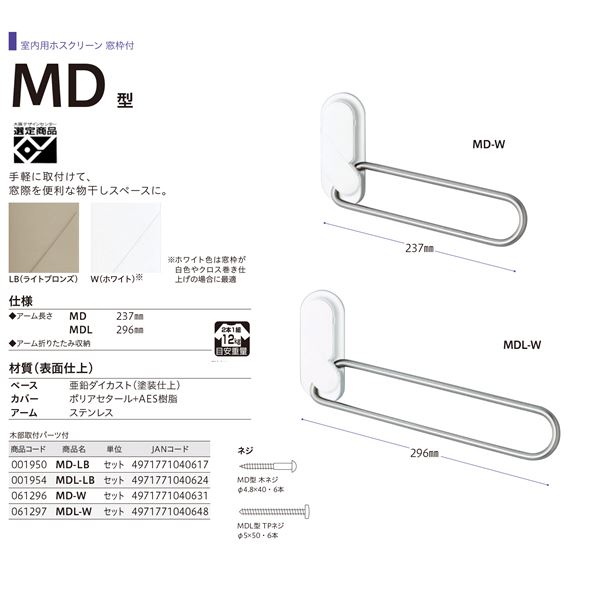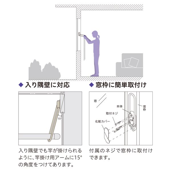室内用窓枠付/シンプルでコンパクトな機構とデザイン。竿無しでも片側にひとつずつ洗濯ハンガーを掛けられます。