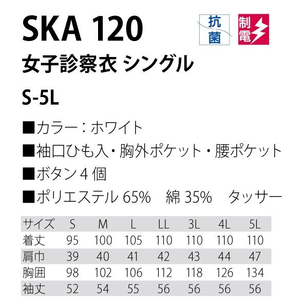 診察衣/白衣 【女子用 シングル/Mサイズ】 抗菌 制電 レディース 袖口ひも入り 胸ポケット・腰ポケット 『workfriend』 SKA120