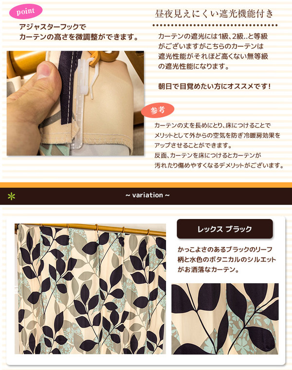フック:※フックはカーテンに予め取り付けられています。アジャスターフックは5mm単位で調整可能です。