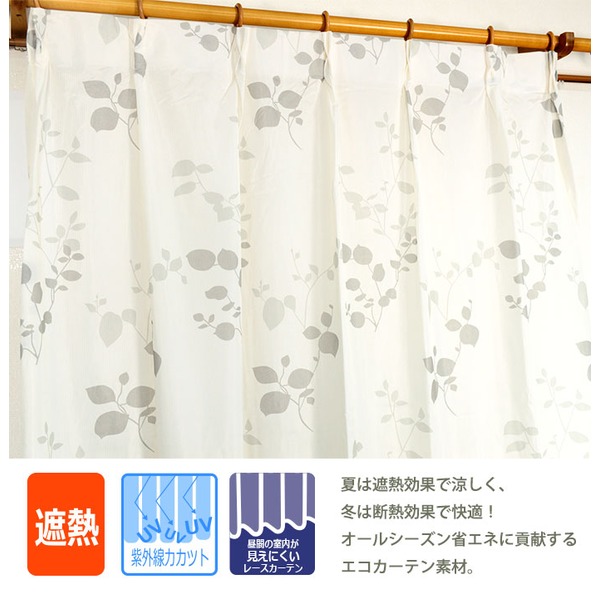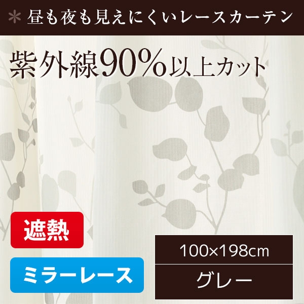 UVカット ミラーレースカーテン 2枚組 / 100cm×198cm / グレー リーフ柄 洗える アジャスターフック付 『トリコットリーフ』 九装