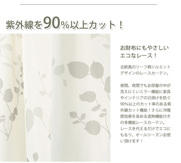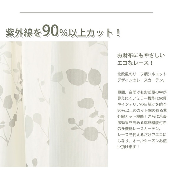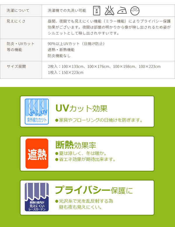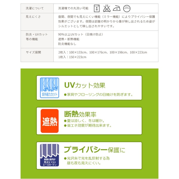 特徴:ミラーレース、UVカット(90%以上)、遮熱、ウォッシャブル(洗濯機可)