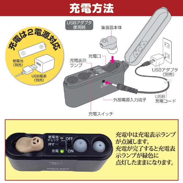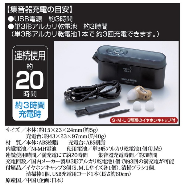 連続使用時間:満充電にて約20時間 集音器充電時間:約3時間