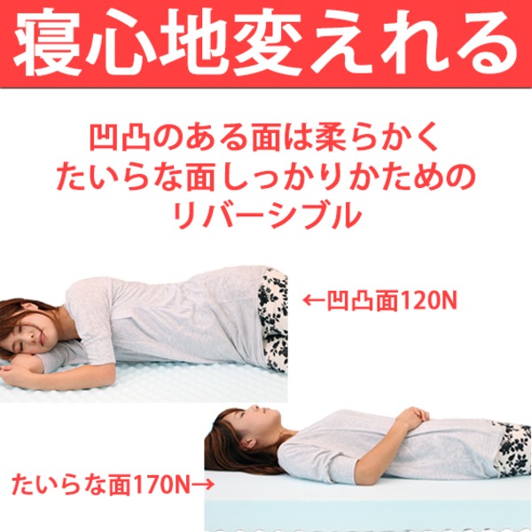 ●万人向けの硬さとして170Nの反発力を採用した硬すぎず柔らかすぎない面とプロファイル加工により120Nの柔らかな寝心地の面のリバーシブル仕様。