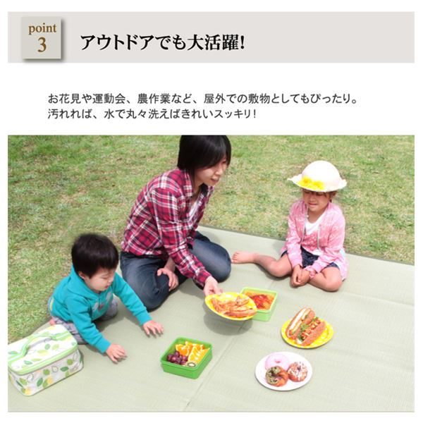 ポリプロピレン素材を細いパイプ状にして織り込んだ敷物で、強度が高くしっかりとしています。汚れても水洗いができるので、いつでも清潔にお使いいただけます。お子様の部屋に、アウトドアに、ペットのいるご家庭に最適な万能カーペットです。※こちらの商品は四方にヘリを付けています。