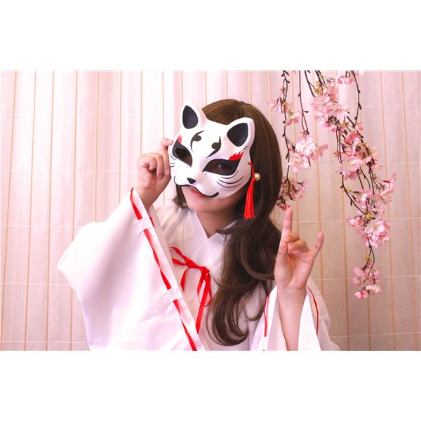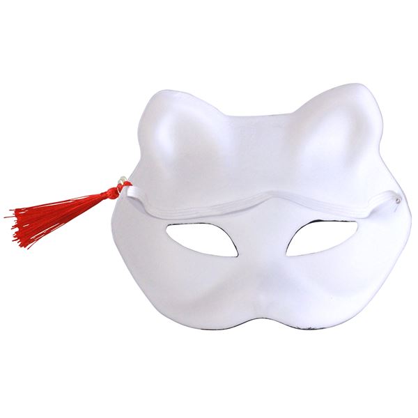 半面タイプのきつねお面。白地に黒と赤の塗り化粧が映えます。サイドに付いた鈴付のタッセルが華やかです。お面は硬い紙製でしっかりしています。