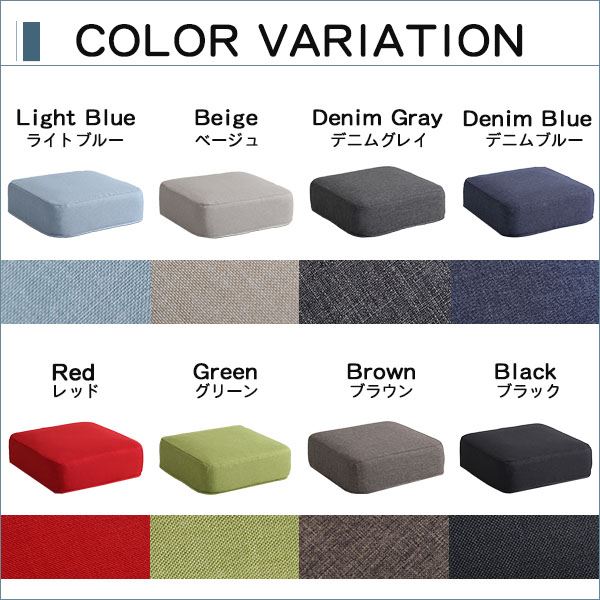 ライトブルー(LBL)、ベージュ(BE)、デニムグレー(GY)、デニムブルー(BL)、レッド(RD)、グリーン(GE)、ブラウン(BR)、ブラック(BK)