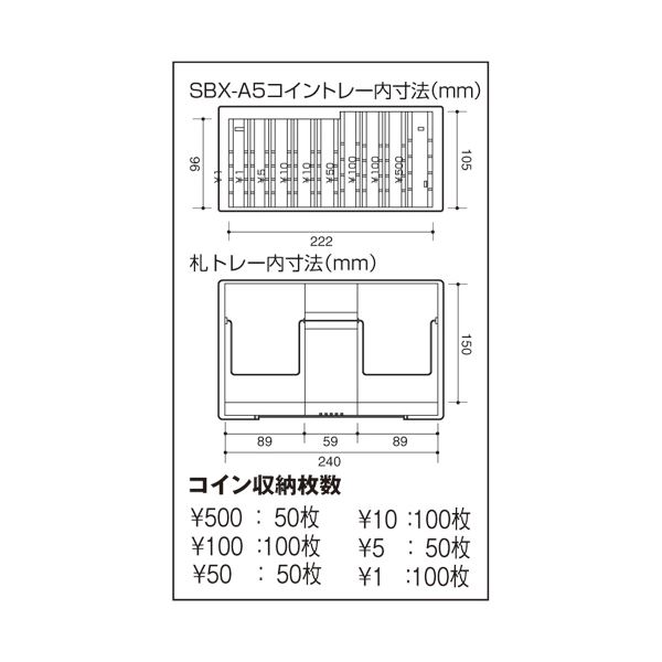 コイン収納枚数:¥500×50枚、¥100×100枚、¥50×50枚、¥10×100枚、¥5×50枚、¥1×100枚