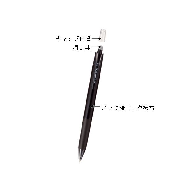 ●筆記時は一般的なノック式ボールペンと同様に、ペン先を下に向けるとスムースにノックが可能です。消去する際は軸を逆さにするだけで内蔵されている「ロック機構」が作動し、消し具を固定するのでしっかりと消すことができます。