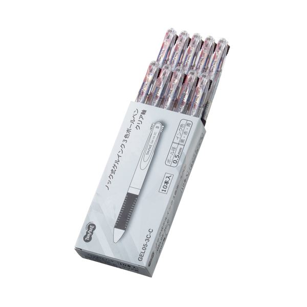 (まとめ) TANOSEEノック式ゲルインク3色ボールペン (軸色 クリア) 1セット(10本) 【×5セット】