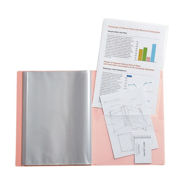 ●表紙裏に、クリアーホルダーもそのまま入る「多機能2段ポケット」が付いて、小さな書類や名刺なども分けて保管できて便利。
