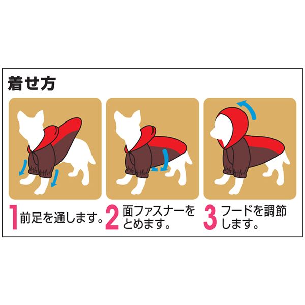 ・じっとするのが苦手なコにも着せやすい、パーカータイプのレインコートです。・光る反射プリントで、ライトがあたるとピカッ!夜の散歩も安心。・雨の日だけでなく、冬の防寒対策にもお使いいただけます。・便利な収納ポーチ付きです。