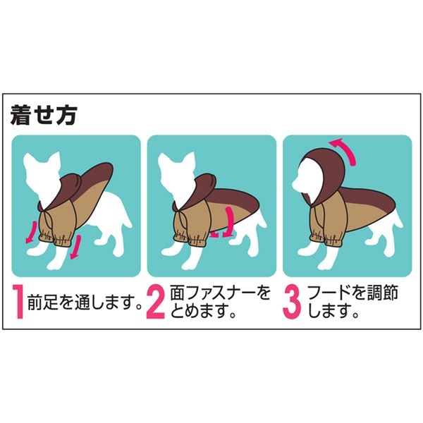 ・じっとするのが苦手なコにも着せやすい、パーカータイプのレインコートです。・光る反射プリントで、ライトがあたるとピカッ!夜の散歩も安心。・雨の日だけでなく、冬の防寒対策にもお使いいただけます。・便利な収納ポーチ付きです。