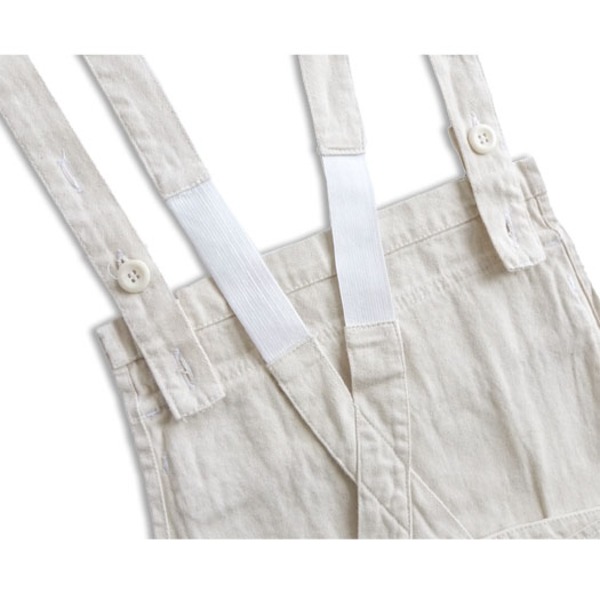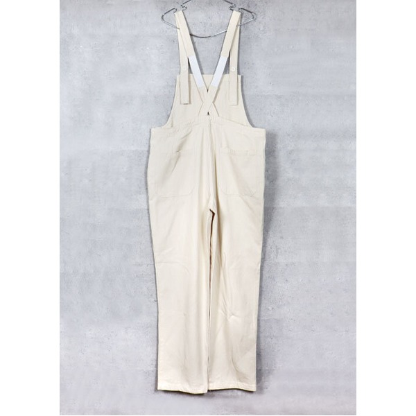 ワンウォッシュされたコットンヘリンボーン地のオーバーオールです。フロントポケットは真ん中に仕切りがあり左右に分かれています。ポケットはサイドポケット、ヒップポケットと合計5ヶ所あります。肩ひもはボタン3個で長さ調整が可能で、ゴムで収縮出来る様になっています。
