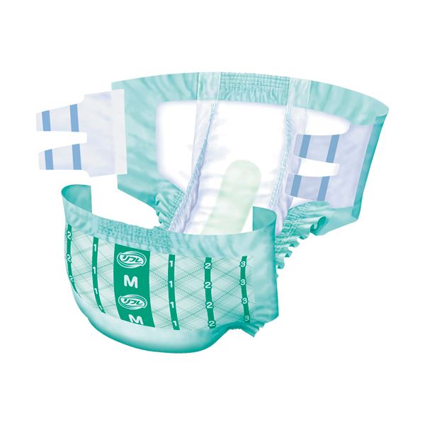 ●2つのギャザーがぴったりフィットして、流れ伝わる尿をしっかりせき止めるテープ止めタイプの大きめLサイズ。