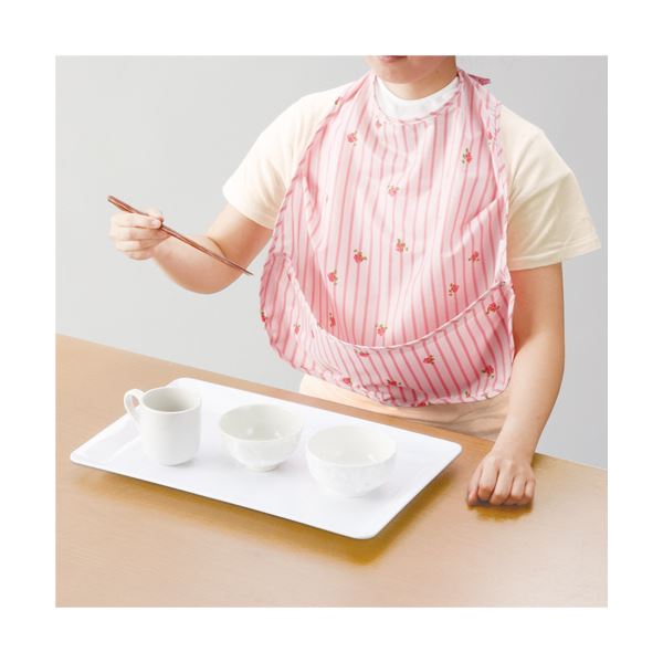 ●「ワイヤー入ワイドポケット付」のため、ポケットを広げたまま固定でき、食べこぼしをキャッチします。