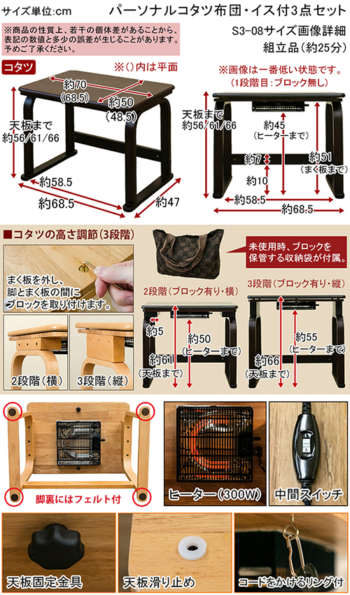 コタツの高さ調整はブロックの取り付け方で調整します。