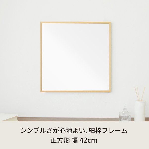 細枠正方形ウォールミラー幅42cm (ナチュラル) 天然木/鏡/スリム/高級感/木製/飛散防止加工/壁掛け/オシャレ/北欧風/日本製/完成品/NK-9