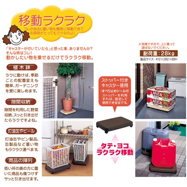灯油缶・ビン製品・缶製品・植木鉢・隙間収納・おもちゃ箱。キャスターのストッパーを利用すれば固定して使用でき安全です。