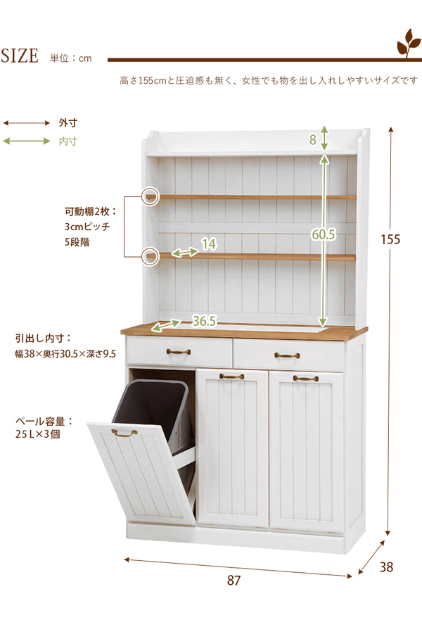 キッチン収納型 ダストボックス 【ナチュラルアイボリー 幅87×奥行38×高さ155cm】 木製 組立品 〔キッチン 台所〕【代引不可】
