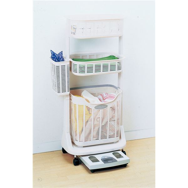 たっぷり収納できる洗濯物入れ。これ1つでいろいろ使える、収容力のある3段タイプのランドリーバスケット。上段・中段には着替えやタオル、普段よく使う小物などの収納に。たっぷり入る下段には洗濯物を放り込めます。下段のバスケットはワゴンから降ろしてそのまま洗濯機へ持って行けるので便利。持ち運びに便利なハンドル付きの下段バスケットです
