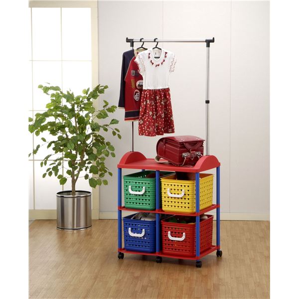 パイプハンガーとバスケット収納が一体となった便利な収納アイテム。これ1つで幼稚園・保育園の制服やバッグ、小学生の体操やランドセル、授業で使う道具などをひとまとめに収納できます。ハンガー耐荷重:約10kg