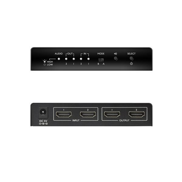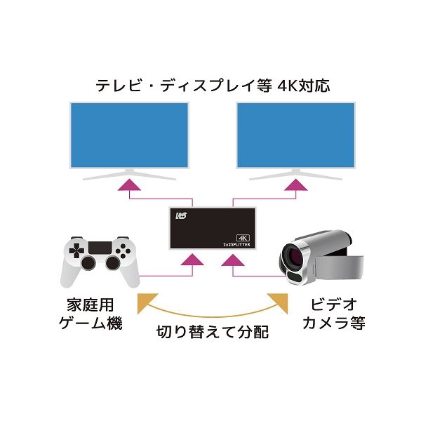 2台のHDMI機器を切り替えて、テレビ2台に分配出力できる入力切り替え機能付きHDMI分配器