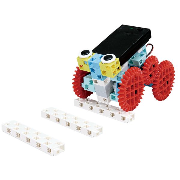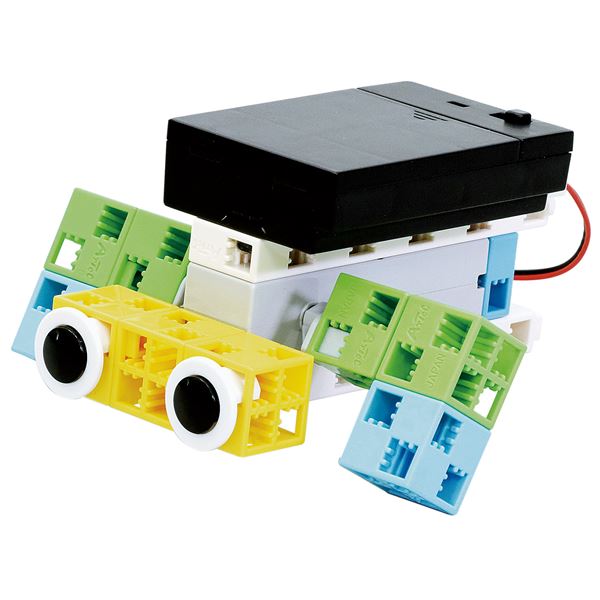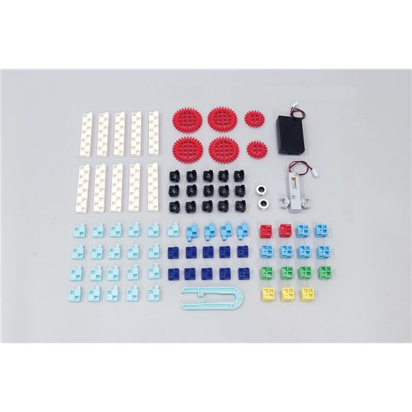 【セット内容】電池ボックス×1、DCモーター×1、ギヤ 大×4、ギヤ 小×2、基本四角・赤×2、基本四角・黄×3、基本四角・水×6、基本四角・黄緑×4、ハーフ・青×10、ハーフ・薄水×21、ハーフ・水×4、ステー×10、回転軸・黒×15、丸(目玉)×2、ブロックリムーバー×1