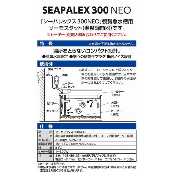 場所を取らないコンパクト設計、簡単水温設定、安心の難燃性プラグ、耐ノイズ設計です。定格電圧:AC100V 50/60Hz