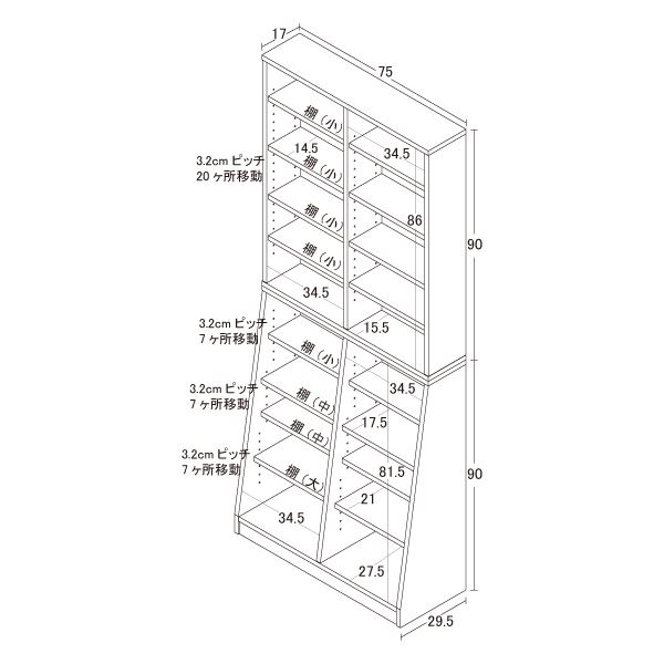 ■詳細:可動棚=小10枚・中4枚・大2枚 上段内寸=約W35×D15×H87cm(2ヶ所) 下段内寸=約W35×D27.5(15)×H81cm(2ヶ所)