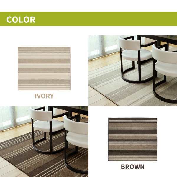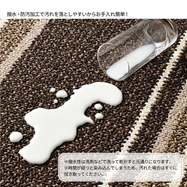 お部屋のアクセントにぴったりなスタイリッシュなデザイン。防ダニ・抗菌・撥水・防汚の機能付きでダイニングだけでなく、リビングにもお勧めです。撥水加工で汚れにくく、水をこぼしても安心です。撥水性は洗剤などで洗って乾かすと元通りになります。裏面は床を傷付けにくい不織布貼りです。