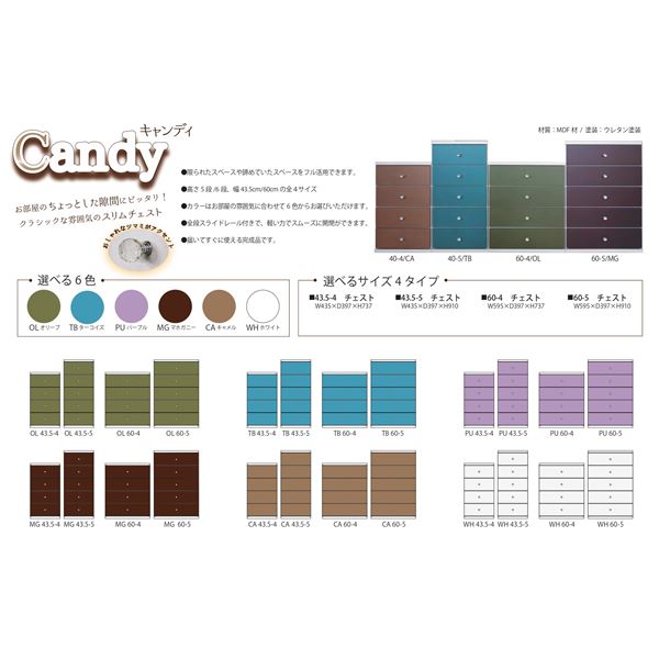 お部屋のちょっとした隙間にピッタリ。限られたスペースを有効活用できるコンパクトチェスト。4サイズ×6カラーから選べます。全段スライドレール付きで開閉楽々。