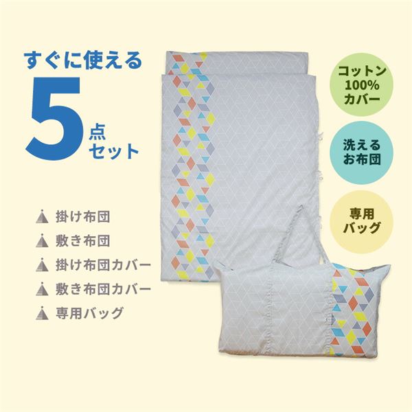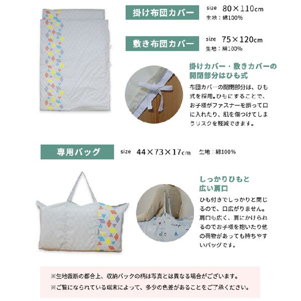 人気の北欧風のカバーは綿100%のなめらかタッチでお子様にも安心。お布団も手洗い可能なので汚れても清潔・安心。持ち運びに便利な専用バッグ付きです。