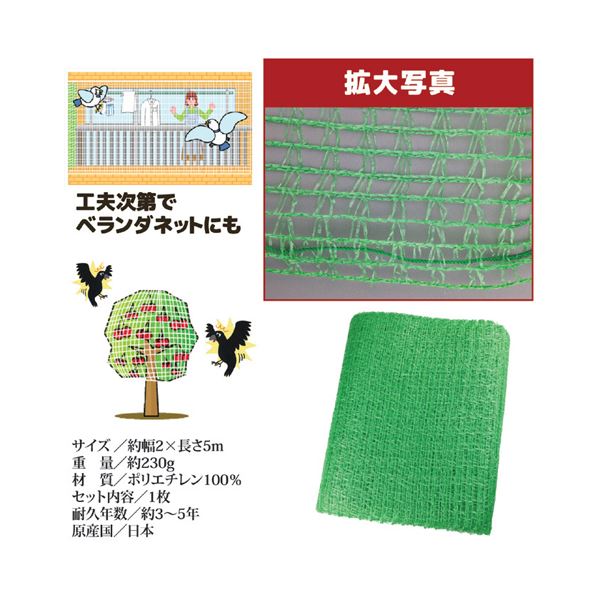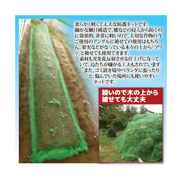 柔らかく軽くて丈夫な防護ネットです。細かな網目構造で、蝶などの侵入から防ぐのに効果的。非常に軽いので、大切な作物の今ご使用のアングルに被せての使用はもちろん、果実などがなっている木々の上から「フワッ」と被せても使用できます。素材も光を乱反射させる仕上げになっていて、鳥たちが嫌がる工夫もされています。また、ゴミ置き場やベランダに張ったりと、悩んでいた場所にも使いやすいネットです。